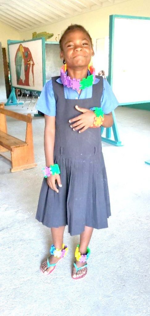Monelle was half way through kindergarten but she did not know her colours or her alphabet and could not count correctly to 20. But she wanted to learn and learn she did. She thrived on the individual attention she received at the Center. Usually first to arrive and last to leave, she loved the crayons and colouring books she did not have in her home. She laughed at the puppets and cuddled the stuffed animals. Her teachers used coloured sticks and bottle tops to teach her to count and eventually to add and subtract numbers.